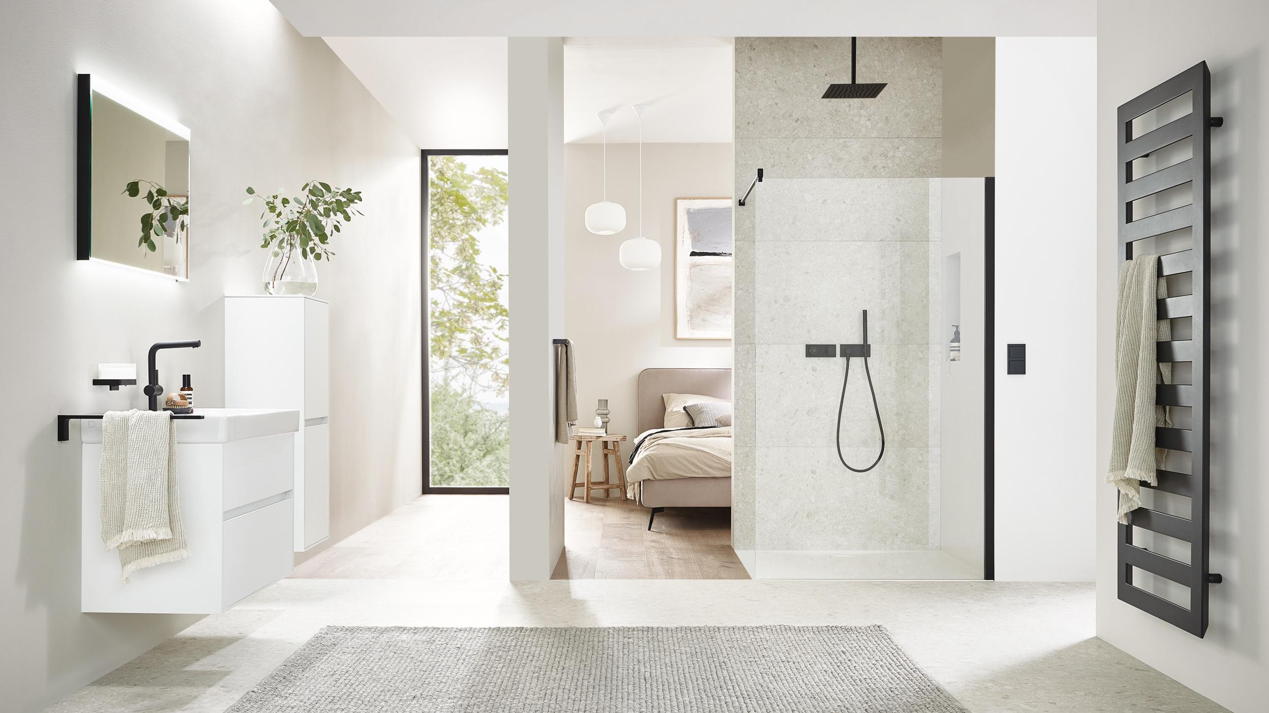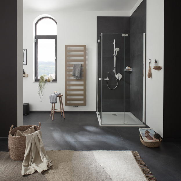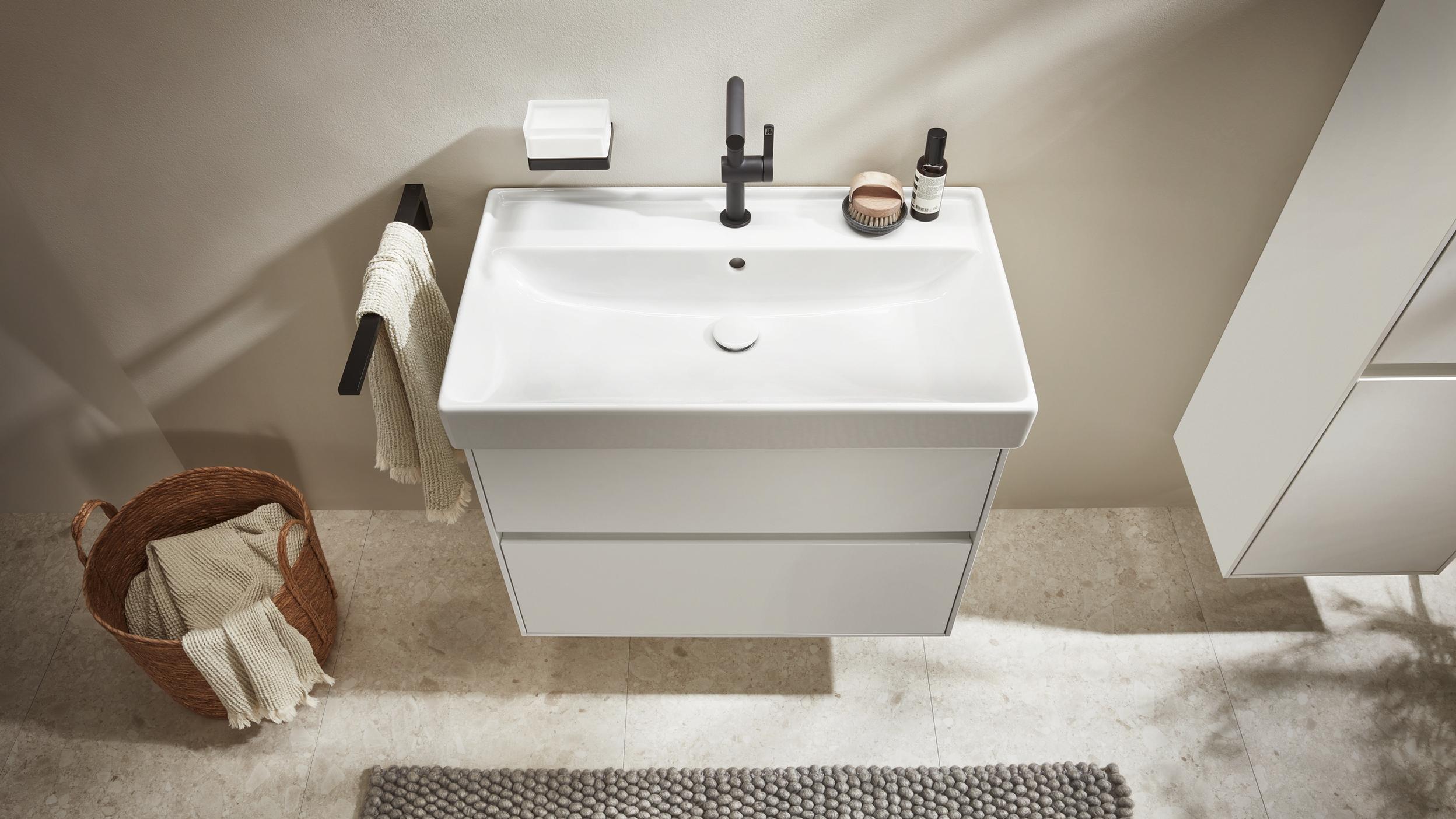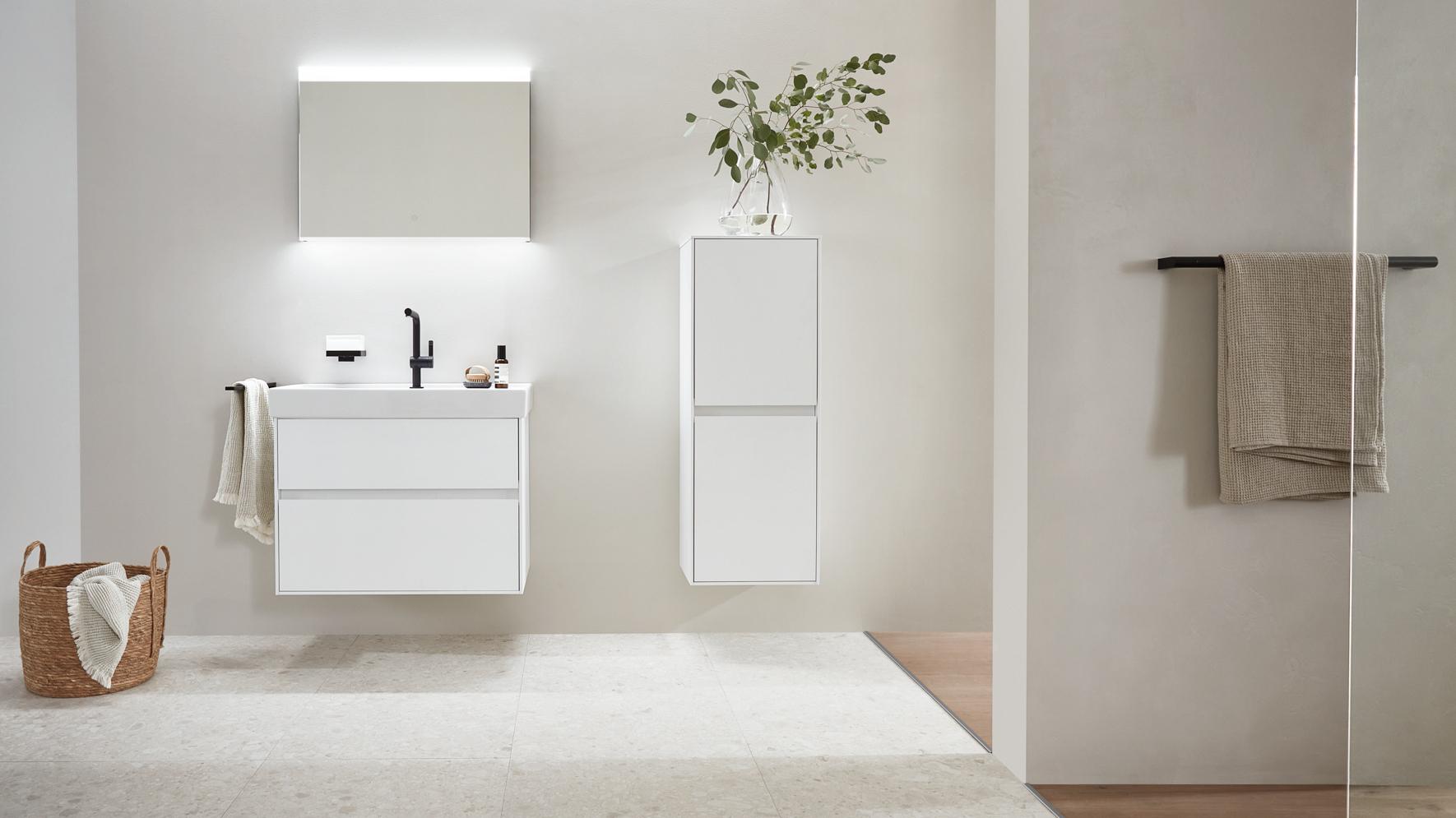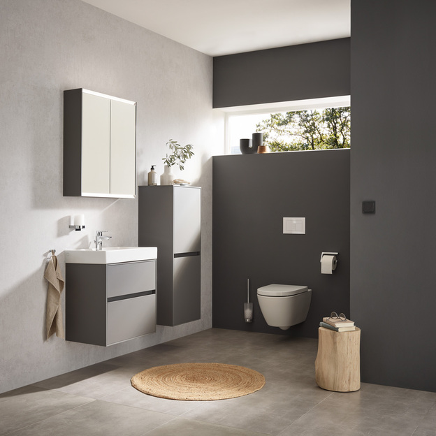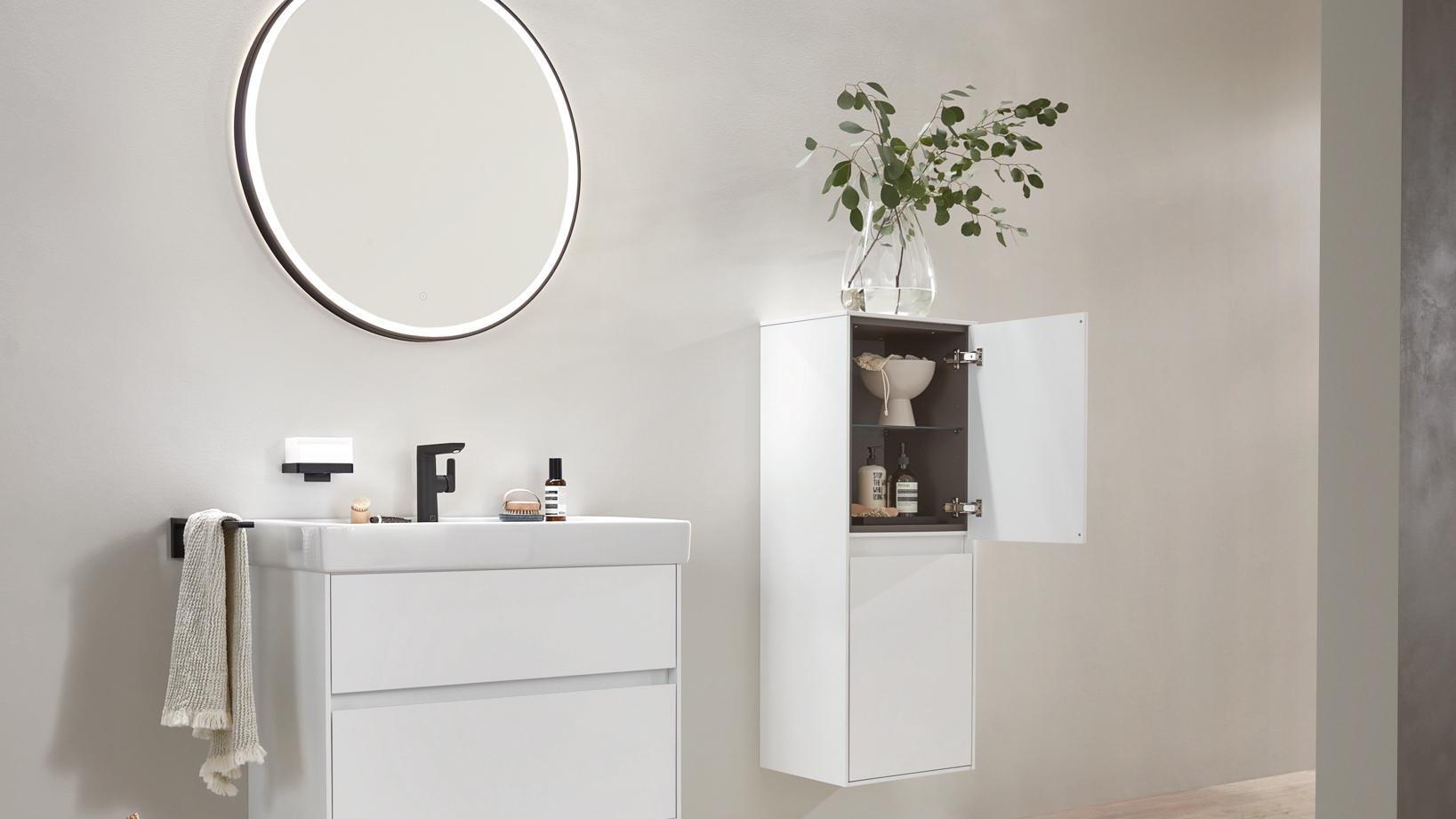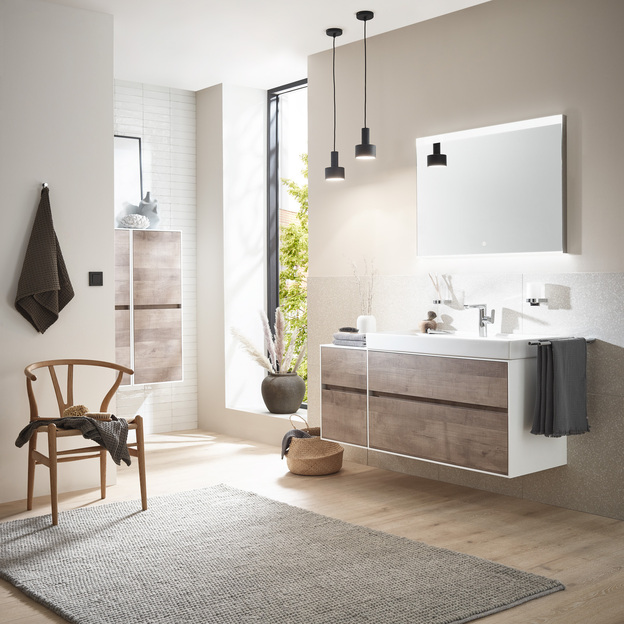 Das wahre Highlight in diesem luftigen Bad sind die kleinen, aber wirkungsvollen Kontraste, die deine Persönlichkeit widerspiegeln. Zwischen den sanften Farbtönen des Raumes und den strahlend weißen Badmöbeln heben sich die mattschwarzen Waschtisch- und Duscharmaturen besonders eindrucksvoll ab. Sie verleihen dem Bad eine zeitgemäße Eleganz und vereinen Funktionalität mit einem Hauch von Raffinesse.