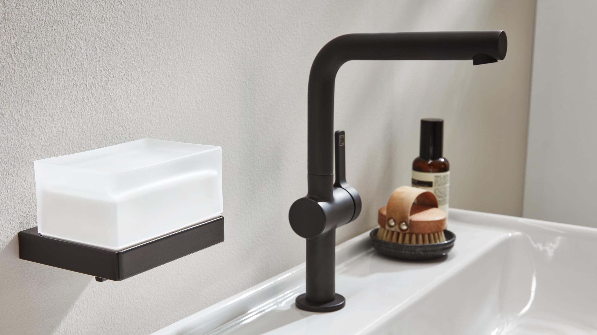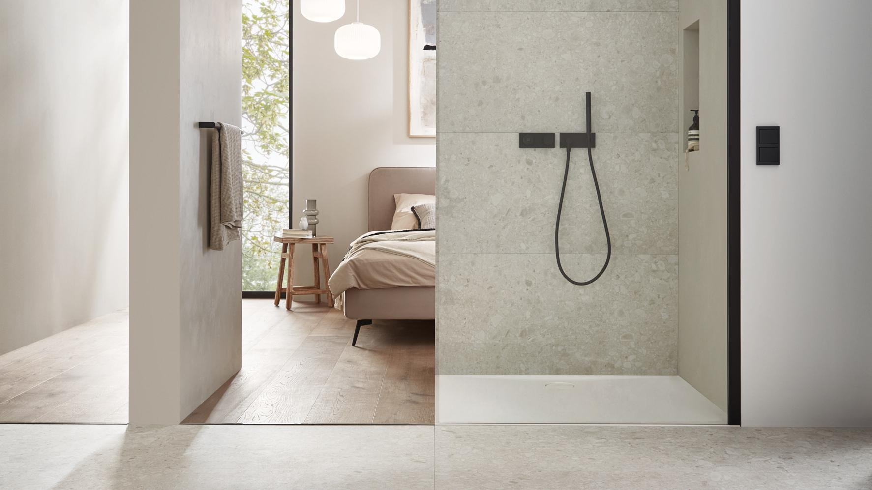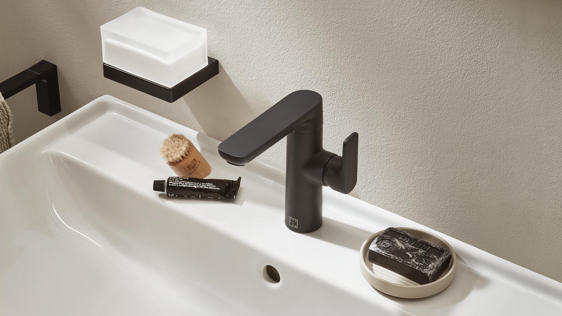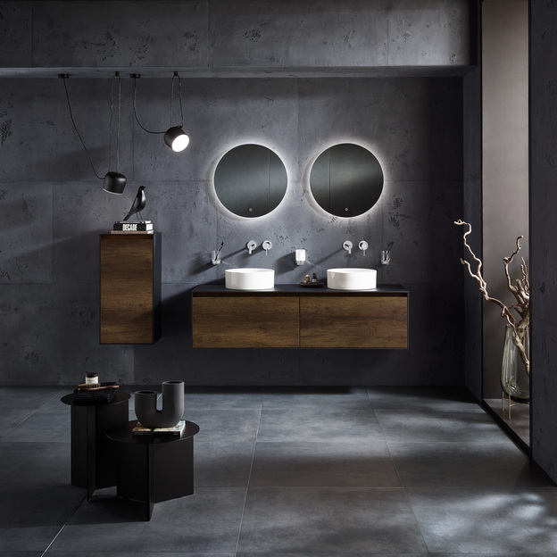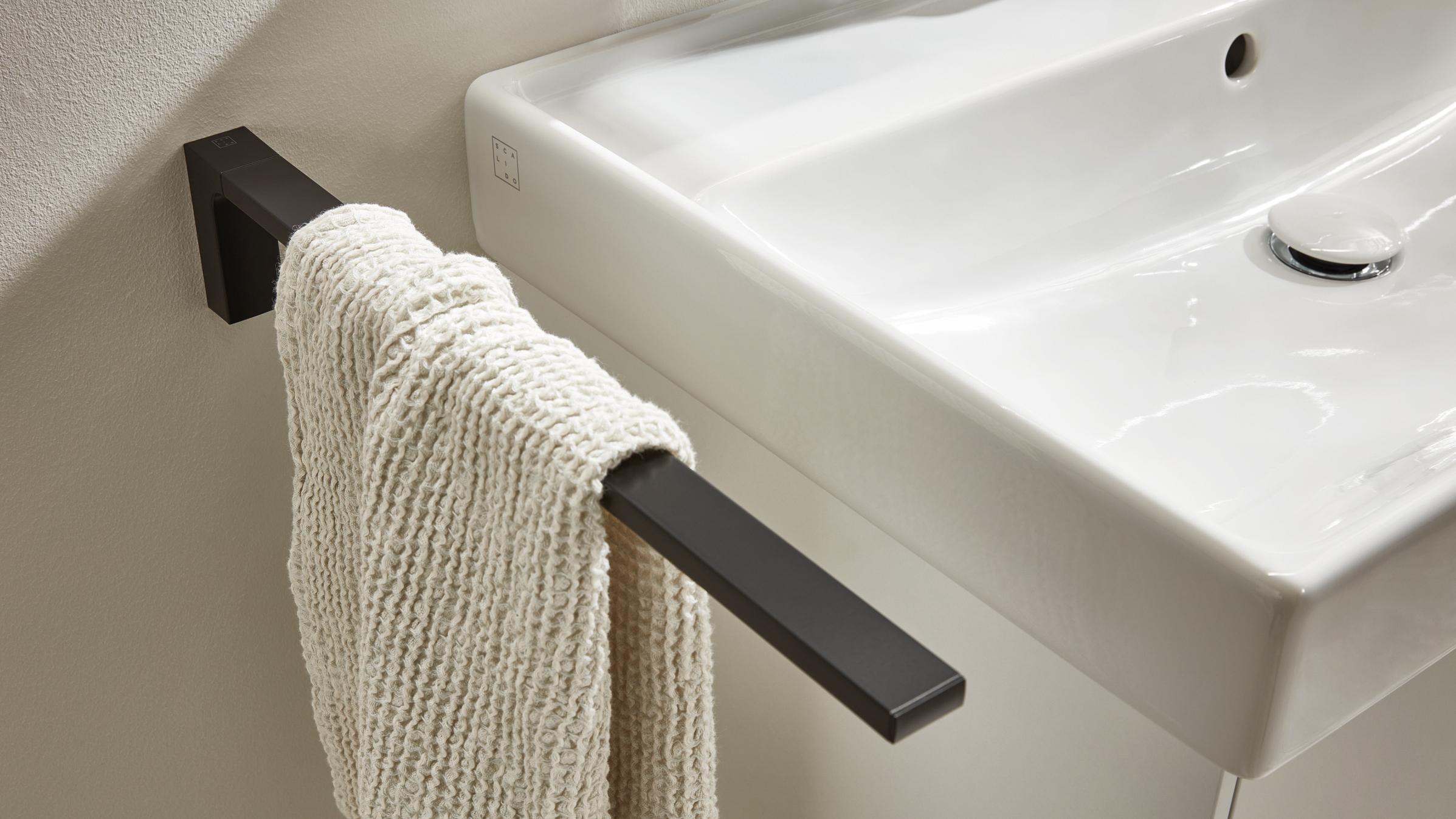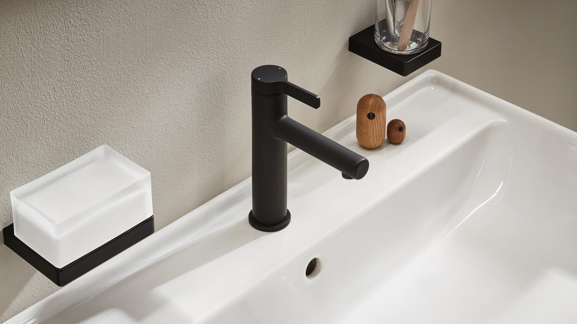 Das wahre Highlight in diesem luftigen Bad sind die kleinen, aber wirkungsvollen Kontraste, die deine Persönlichkeit widerspiegeln. Zwischen den sanften Farbtönen des Raumes und den strahlend weißen Badmöbeln heben sich die mattschwarzen Waschtisch- und Duscharmaturen besonders eindrucksvoll ab. Sie verleihen dem Bad eine zeitgemäße Eleganz und vereinen Funktionalität mit einem Hauch von Raffinesse.
