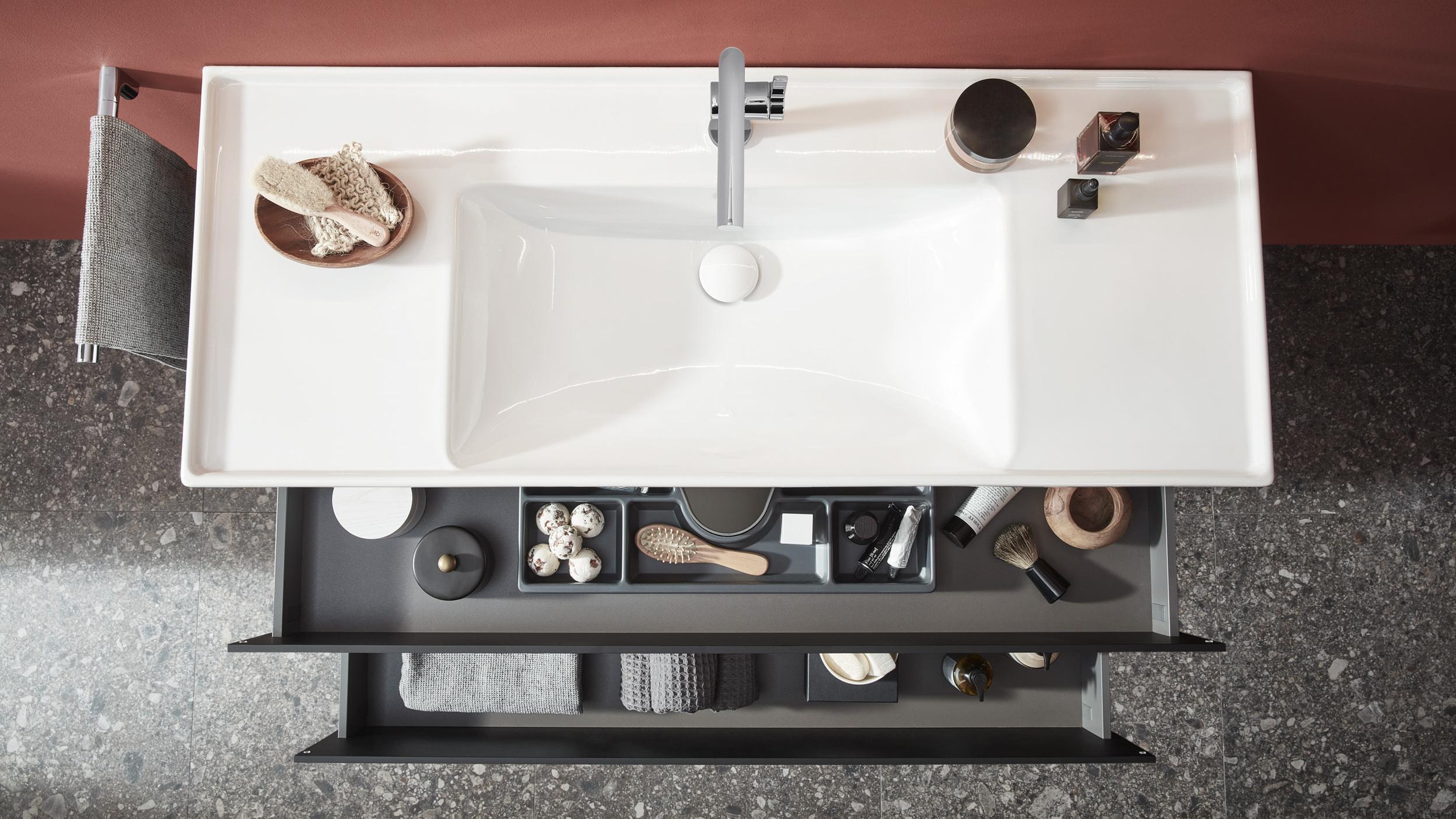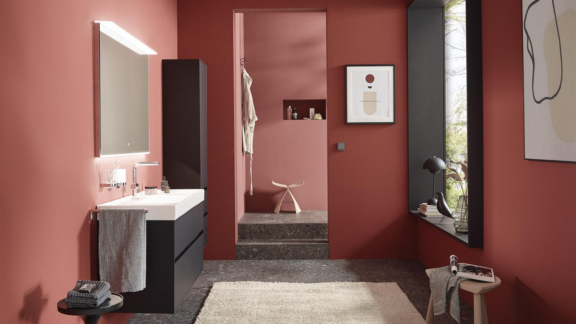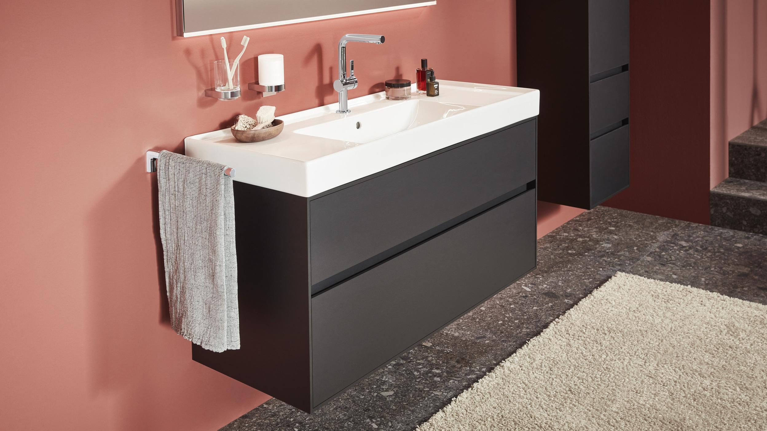 Der charakterstarke Schrankwaschtisch mit Ablagefläche bietet genug Platz für Rasierer, Zahnbürste und Seife – eben alle Produkte, die für dich immer griffbereit stehen sollten. Mit umlaufender Kante und hohem Auslauf ausgestattet, ist der Waschtisch im Alltag besonders praktisch. Der großflächige LED-Touchspiegel und die vulkanschwarzen Badmöbel setzen den gesamten Waschtischbereich gekonnt in Szene.