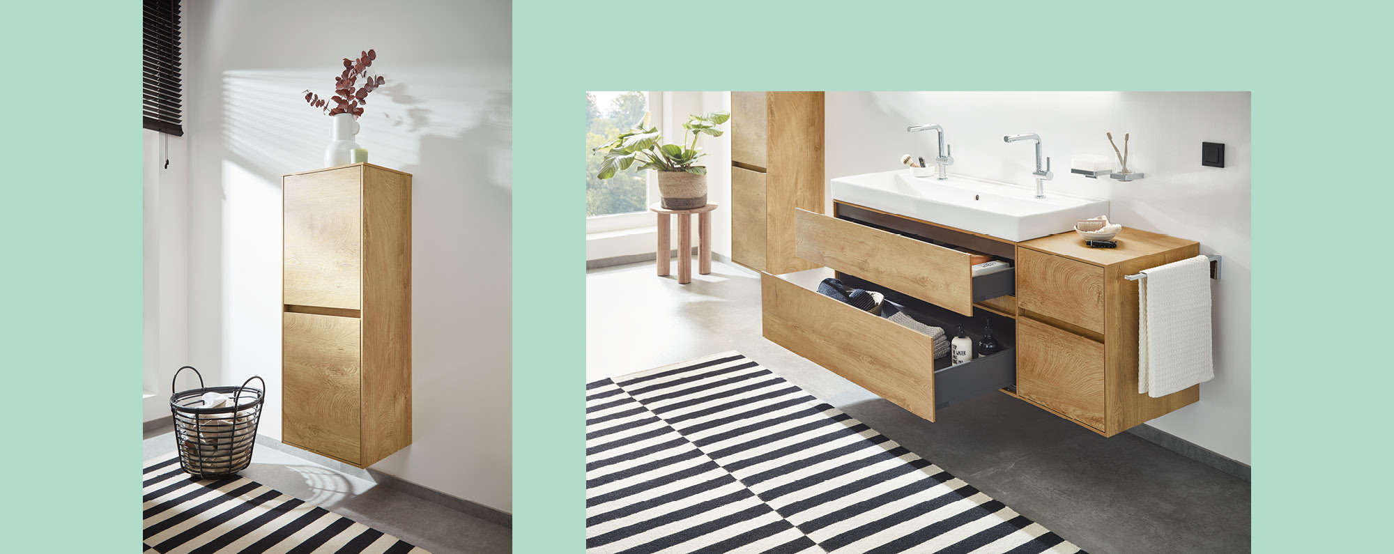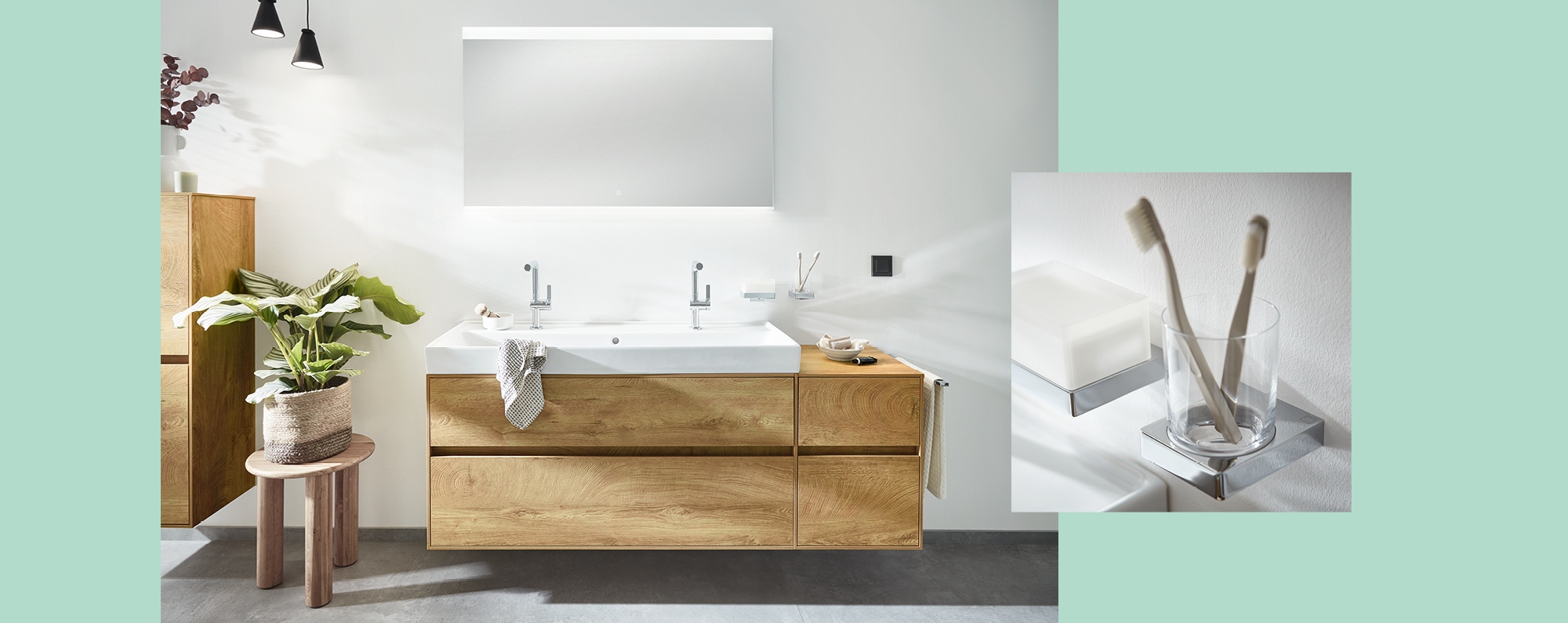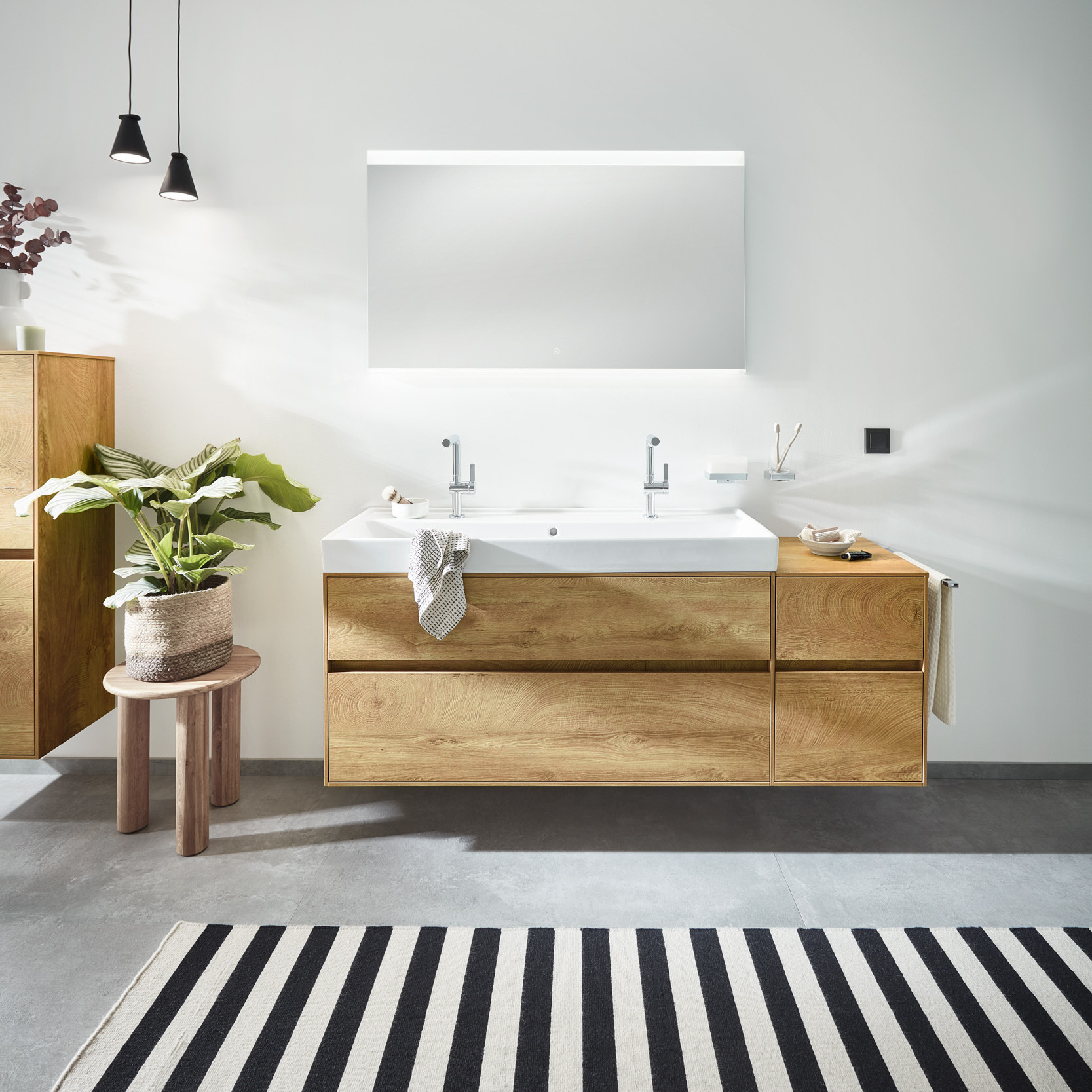 Die extragroße, begehbare Dusche ist definitiv ein Hingucker, aber auch der Waschplatz war für Tara und Fabian besonders wichtig. Mit dem geräumigen Unterschrank, dem beleuchteten Spiegelschrank sowie dem Doppelwaschtisch mit durchgehendem Becken bietet er genügend Platz für alle wichtigen Dinge und vereinfacht so die zeitgleiche Morgenroutine der beiden. Beim Papierhalter mit zusätzlicher Ablage wird dann wieder die Detailliebe des Paars sichtbar: „Das musste sein“, sagt Tara schmunzelnd. „Nicht unbedingt nur für das Handy, aber auf jeden Fall für die Duftstäbchen.“