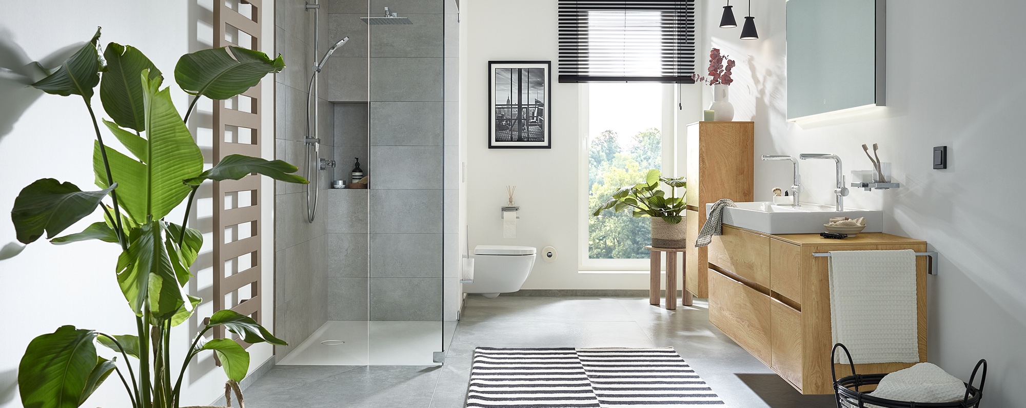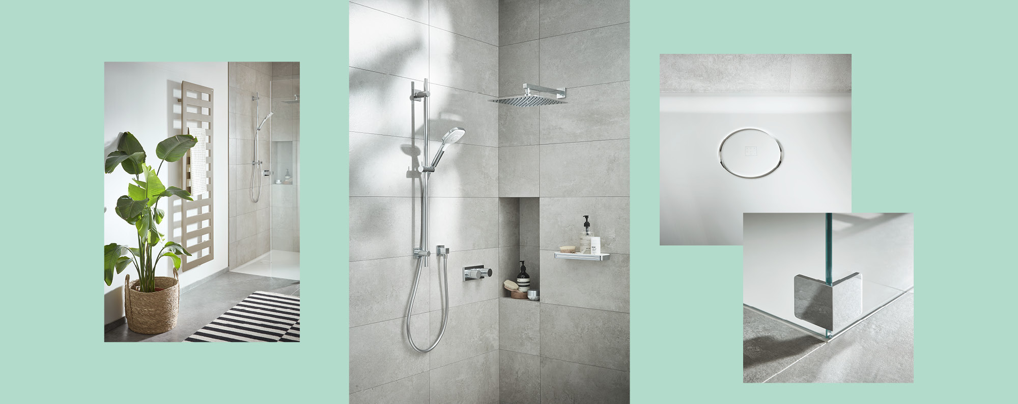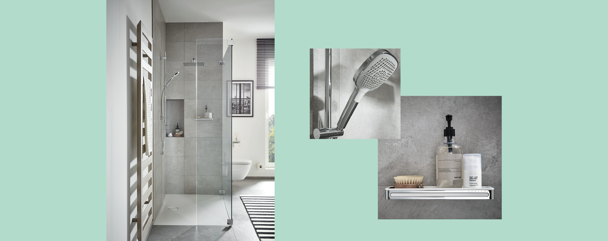Beide lieben ihre großzügige WalkIn Dusche mit der zusätzlichen Kopfbrause. Dank der halb offenen Duschwand braucht es keine Tür und das Bad wirkt noch einladender und offener. Stahl-Duschfläche (Art.-Nr. 7787209) | Duschwand (Art.-Nr. 8320382) | Brauseset inkl. Wandstange (Art.-Nr. 7904934) | Kopfbrause (Art.-Nr. 7907437) | Brausearm (Art.-Nr. 7907439)