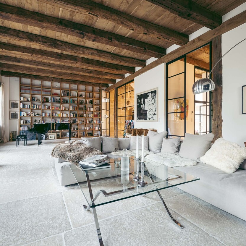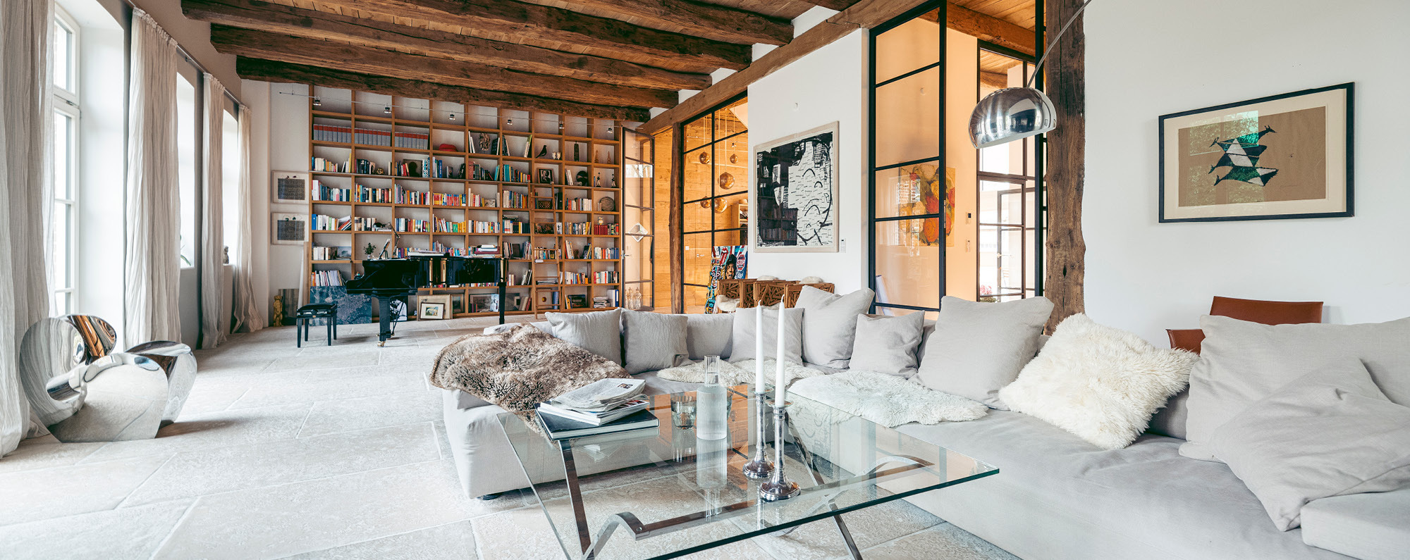 Durch den Umbau hat sich bei Georg und Marith viel getan, doch die besondere Atmosphäre in ihrem Zuhause ist erhalten geblieben. Hohe Decken und robuste Holzelemente treffen auf moderne Möbelstücke und ausdrucksstarke Kunstobjekte. Besonders beeindruckend: Über die gesamte Wand im Wohnraum erstreckt sich ein Bücherregal bis zur Decke, liebevoll bestückt mit jeder Menge Büchern, Georgs Sammlungen an Miniaturfiguren und bunten Familienporträts.
