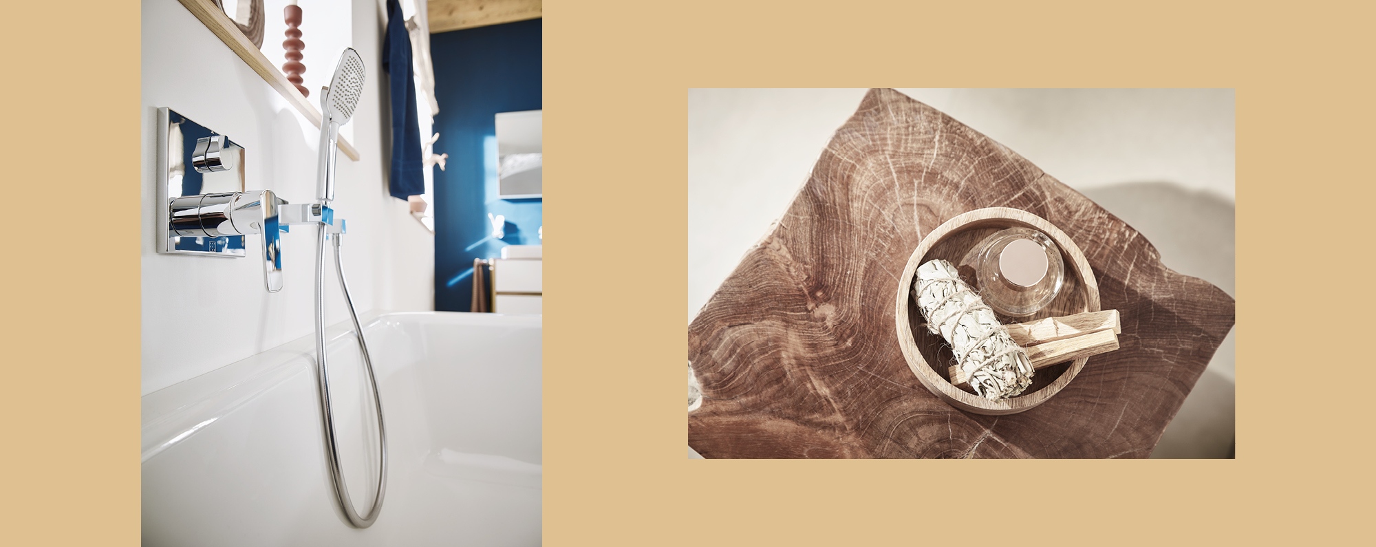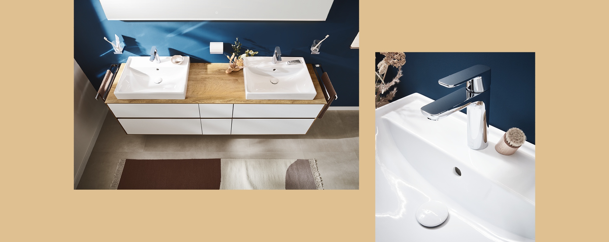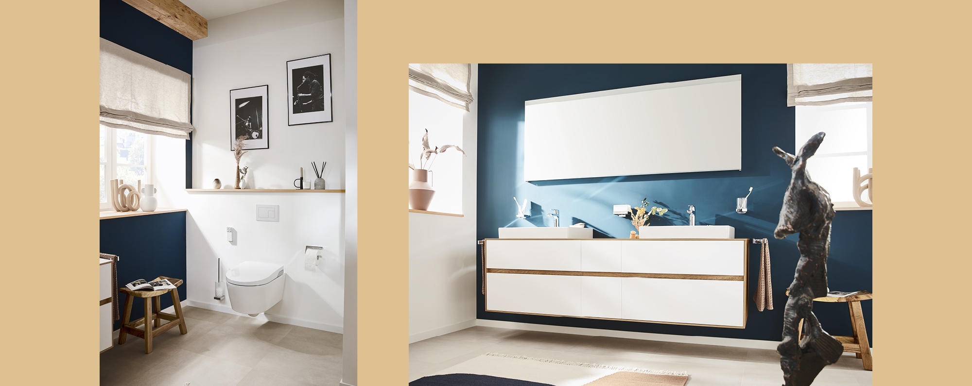 Auch im Bad von Georg und Marith zeigt sich der Charakter des ganzen Hauses. Der großzügige Waschplatz mit breiter Spiegelfront und doppelten Aufsatzwaschtischen wird durch den meerblauen Hintergrund abstrakt in Szene gesetzt. Mit der grazilen Badewanne hat sich Marith einen Wunsch erfüllt: „Wenn ich bald mehr Zeit habe, kann ich von hier aus mein neues Bad genießen.“