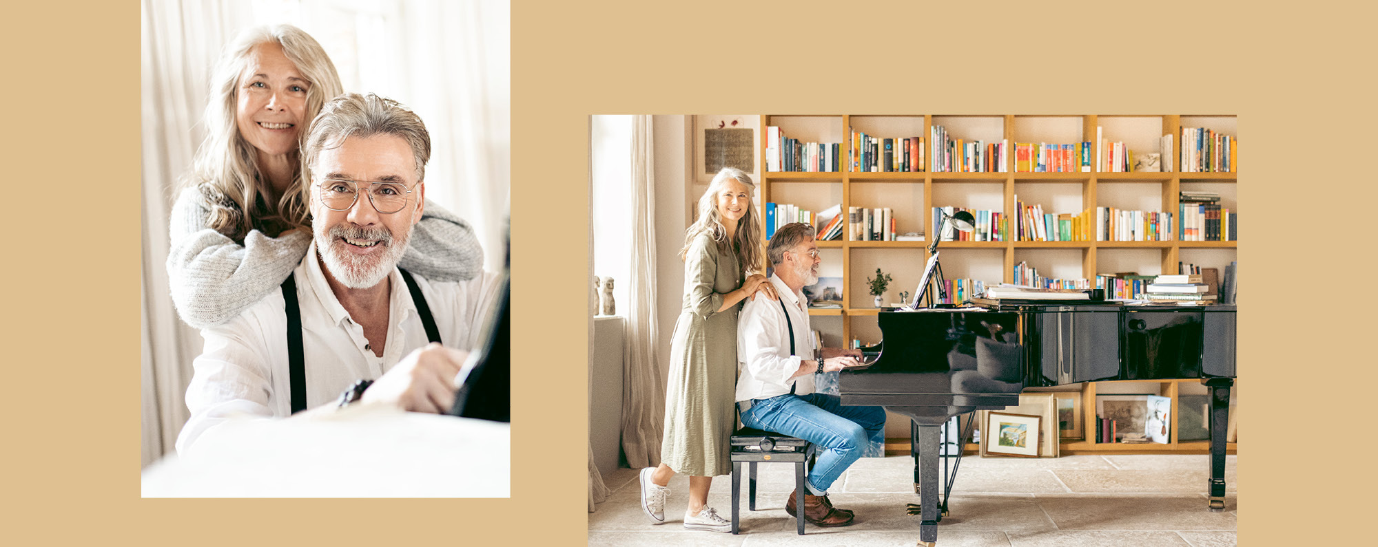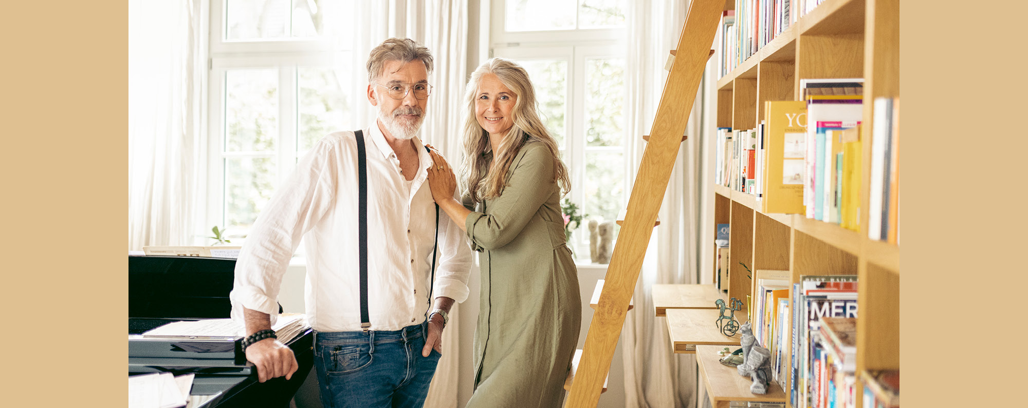 „Wir waren schon immer Genussmenschen“, erzählt Georg. Egal ob guter Kaffee, eine spannende Lektüre oder ein fesselndes Musikstück, ihre Begeisterung für Kunst und Kultur ist vielfältig. Das unterstreicht auch das eindrucksvolle Klavier direkt vor dem imposanten Bücherregal. Zusammen spielen und singen, das macht dem Ehepaar schon immer am meisten Freude – auch gerne gemeinsam mit ihren mittlerweile erwachsenen Kindern.