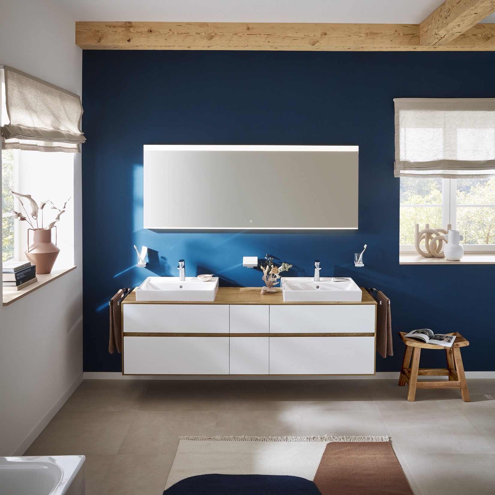 Auch im Bad von Georg und Marith zeigt sich der Charakter des ganzen Hauses. Der großzügige Waschplatz mit breiter Spiegelfront und doppelten Aufsatzwaschtischen wird durch den meerblauen Hintergrund abstrakt in Szene gesetzt. Mit der grazilen Badewanne hat sich Marith einen Wunsch erfüllt: „Wenn ich bald mehr Zeit habe, kann ich von hier aus mein neues Bad genießen.“